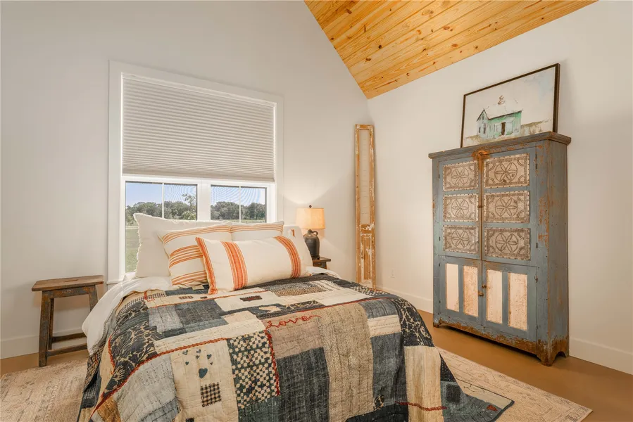 Lovely old-world inspired 3 bedroom/2 bath home on sought-after Guenther Rd! Features: open concept, dramatic soaring pine ceilings in living areas, Low-E windows, Hardi plank exterior, split floorplan, water softener, buried propane. The kitchen showcases custom open pecan shelves, an ILVE range imported from Italy, a vintage farmhouse sink, walk in butler’s pantry and a 9-ft antique island. This country home blends simplicity & functionality of minimalism w/cozy, natural aesthetic of the countryside, emphasizing clean lines, natural materials, neutral color palettes, and uncluttered open spaces to create a serene and harmonious retreat. Excellent location between Houston & Austin and only a short drive to charming, historical Round Top! This one is special!