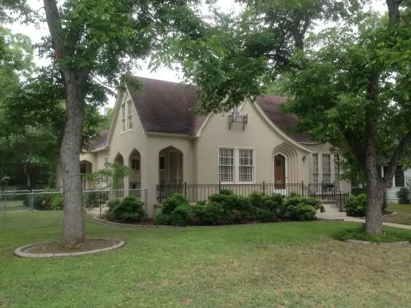 1930s dollhouse wait til you see! Adorable stucco with gorgeous features; such as, cathedral ceiling in living room, beautiful archways, exterior door and porch for each bedroom, wood floors throughout, three 7-foot windows in living room, attic space to convert, garage room for office or guest quarters, two Juliet windows with wrought iron balconies, charming tile bathrooms. Come see!