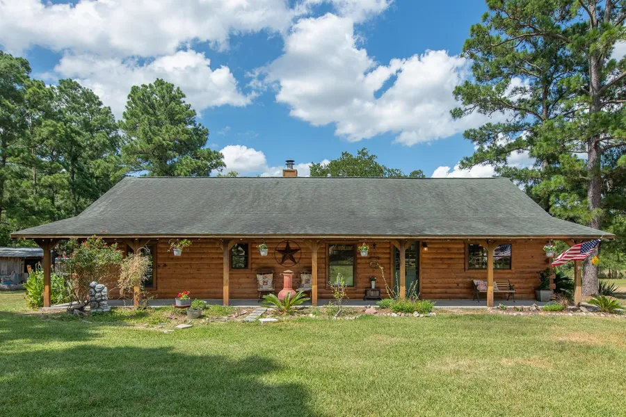 In the Piney Woods near Winchester, on small acreage just outside of La Grange the country life you have been seeking you awaits. Heavily treed with Oaks, Pecans, Loblolly Pines, and Willows around the pond are the coming attraction upon entry. Reasonable restrictions exist but there is No HOA. Beautiful and comfortable, this well maintained property is fully fenced and has underground electric, a log cabin home, with a small workshop (has electric/water) and a one-acre stocked/Spring-fed pond constructed with a 20 foot-depth. Freshly painted and updated, you will want to experience the spacious Living/Dining/Kitchen area that is open with a vaulted ceiling, a fireplace, and French doors leading to the covered back porch. You will enjoy wide 6 - 8 foot depth covered porches to enjoy sunrise for your early morning coffee/sunsets to enjoy your favorite glass of wine.