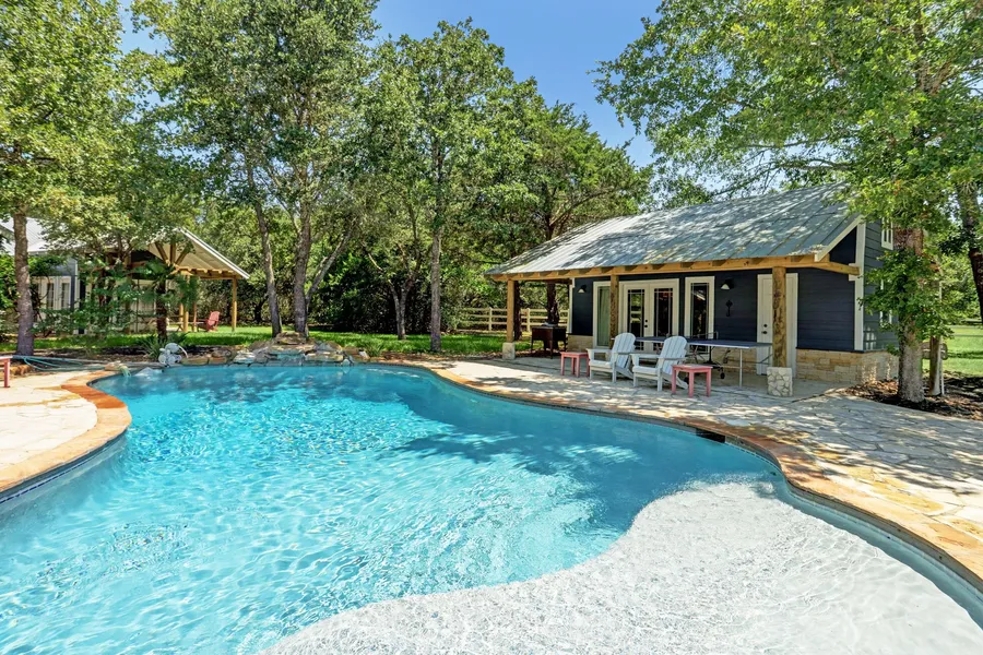 This location is serenely perfect with the lush greenery of the 8.7 acre property and the tranquility only the countryside can offer. The main house features four bedrooms, three full baths, large spacious living room with vaulted ceiling, kitchen and dining area. The interior is designed with an eclectic mix of rustic and modern styles that instantly make you feel at home. Its open concept ensures an abundance of natural lighting. The guest house provides a cozy place for guests to enjoy. It features two bedrooms, one bath, living area and kitchen. The swimming pool provides a perfect place to relax. The pool house serves as a great cabana. The pond with its piers is like a camp dream. The pool, fire pit, and pond complete the picturesque setting. Only minutes away from the center of Round Top, the property is close enough to enjoy the town's amenities but far enough to enjoy the peace ...