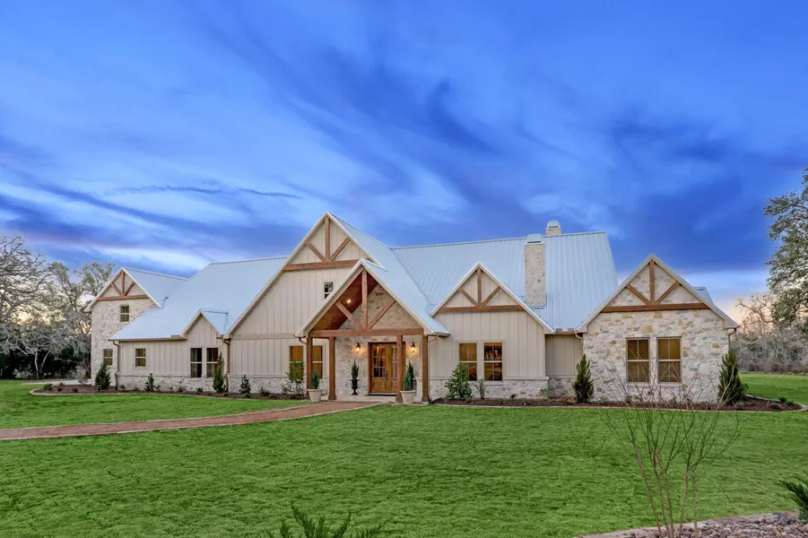 Situated on coveted Hartfield Road, this recently constructed Round Top retreat is ensconced amid Live Oaks, spanning over 12 picturesque acres, tailored for discerning buyers. This meticulously designed property showcases impeccable style and artistry, with attention placed on every detail. Highlights include stunning beamed ceilings, 3 generously proportioned fireplaces, beautifully crafted wood floors, and a stunning gourmet kitchen with Thermador appliances. Rich natural light flows throughout the downstairs entertaining spaces. Beautiful galleries take you from room to room and allow spaces to showcase your art collections. The exceptional floor plan offers privacy and separation of space with the 2 primary suites and two en-suite guest bedrooms downstairs. Upstairs is a private sanctuary boasting living space, a full bath, and walk-in closet. The oversized 3-car garage is air-conditioned and ready to serve all your needs. The attic is floored and climate-controlled for all your storage needs. This captivating property invites you to indulge in an enchanting sanctuary.