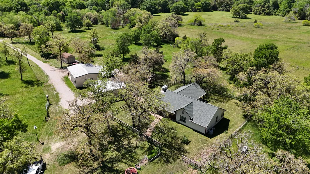 Metal building dream workshop with lean-to has 2 garage doors, built in metal shelves suspended from ceiling, electrical and cement floor plus an oversized double car garage. Playscape to convey. Property has a well and Fayette Co Rural water, beautiful mature trees and borders the Live Oak Creek which draws wildlife to the area. Hunt for deer, turkeys and more! Perfect property for outdoor activities and livestock, agricultural valuation by livestock. Great county location just 25 minutes from Smithville. New survey. Location: end of Roy Road for privacy. Garage 30x30 Lean-to 40x18 yr 2020/ Workshop 30x25 +15 covered yr 2018.