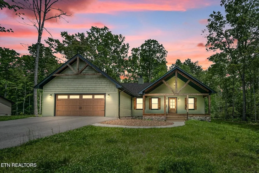 Backup offers welcome! Experience the perfect blend of traditional charm and modern living with this pristine 3-bedroom, 2-bath home. You will be captivated by the grand timber frame covered porches, providing an ideal space for outdoor entertaining or simply sipping your morning coffee in peace. Warm yourself by the cozy gas log fireplace during cooler times, creating a soothing ambiance in which to relax or visit with family and friends. Enjoy every culinary experience in a charming kitchen, accentuated by open and closed shelves offering ample storage, as well as a large granite countertop island that promises enough space for cooking and gathering. The on-demand tankless water heater ensures you never run out of hot water, even during the busiest mornings or when hosting guests. The home is also built with an encapsulated crawlspace, creating an excellent barrier from moisture and temperature extremes while extending the life of your home. Grab a chair and listen to the soft sounds of the babbling brook harmonize perfectly with the symphony of chirping birds and rustling leaves as the sunlight filters through the trees. It is the setting for moments of introspection, relaxation, and inspiration. This beautiful property seamlessly combines elegance and functionality to provide a truly comfortable living experience. Take the first step towards your dream home today.