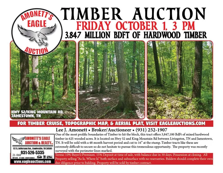 One of the most prolific boundaries of TImber to hit the block, this tract offers 3,847,100 BdFt of mixed hardwood timber in 701+/- wooded acres. It is located on Hwy 52 and King Mountain Rd between Livingston, TN and Jamestown, TN. It will be sold with a 48 month harvest period and cut to 16 at the stump. Timber tracts like these are extremely difficult to secure so do not hesitate to pursue this tremendous opportunity. The property was recently surveyed with the perimeter lines marked.