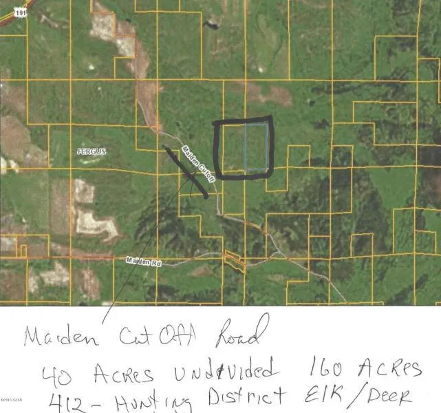 MONTANA LAND AT IT'S FINEST,IN THE MAJESTIC JUDITH MOUNTAINS,SOME OF THE BEST BOW HUNTING FOR ELK IN MONTANA, 40 ACRES IN THE MIDDLE OF 160 ACRES UNDIVIDED (YOU GET TO USE THE WHOLE 160 ACRES)SEVERAL SPRINGS WHERE ELK AND CATTLE DRINK (ELK WALLOW IN) OLD HOMESTEAD (NO BUILDINGS)160 ACRES FENCED WITH BARB WIRE FOR CATTLE. 1/4 MILE OFF MAIDEN CUTTOFF (COUNTY ROAD).
