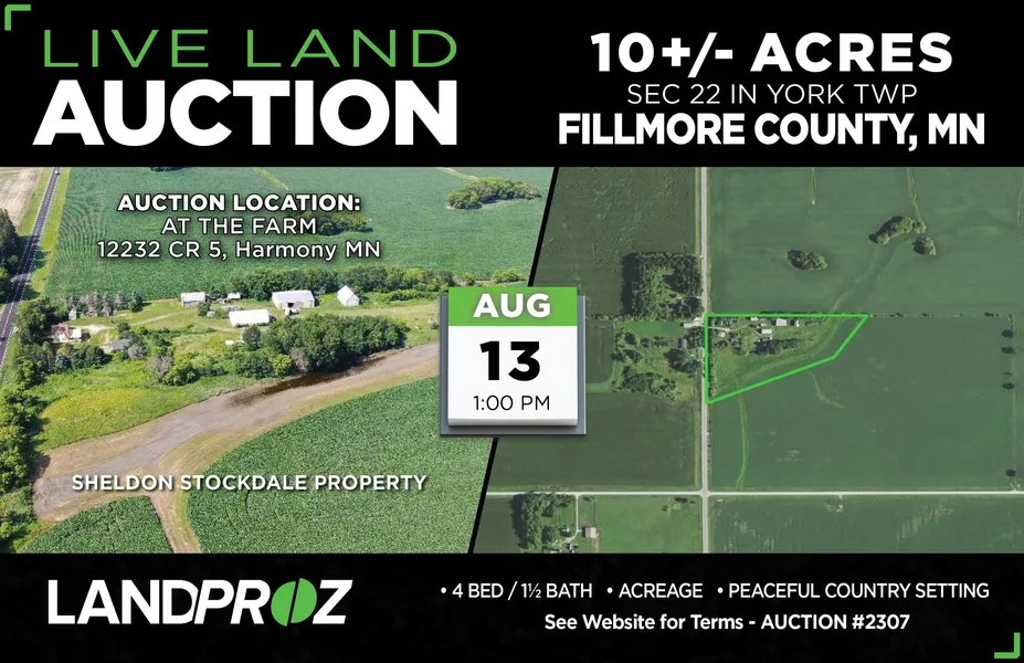 $20,000 [non-refundable] down on the day of the sale. Balance due at closing on or before September 13, 2022. Any statements made the day of the auction take pecedence over previous materials. All information provided herein was obtained from sources deemed reliable, but neither the auction company nor the seller guarantee it's accuracy.