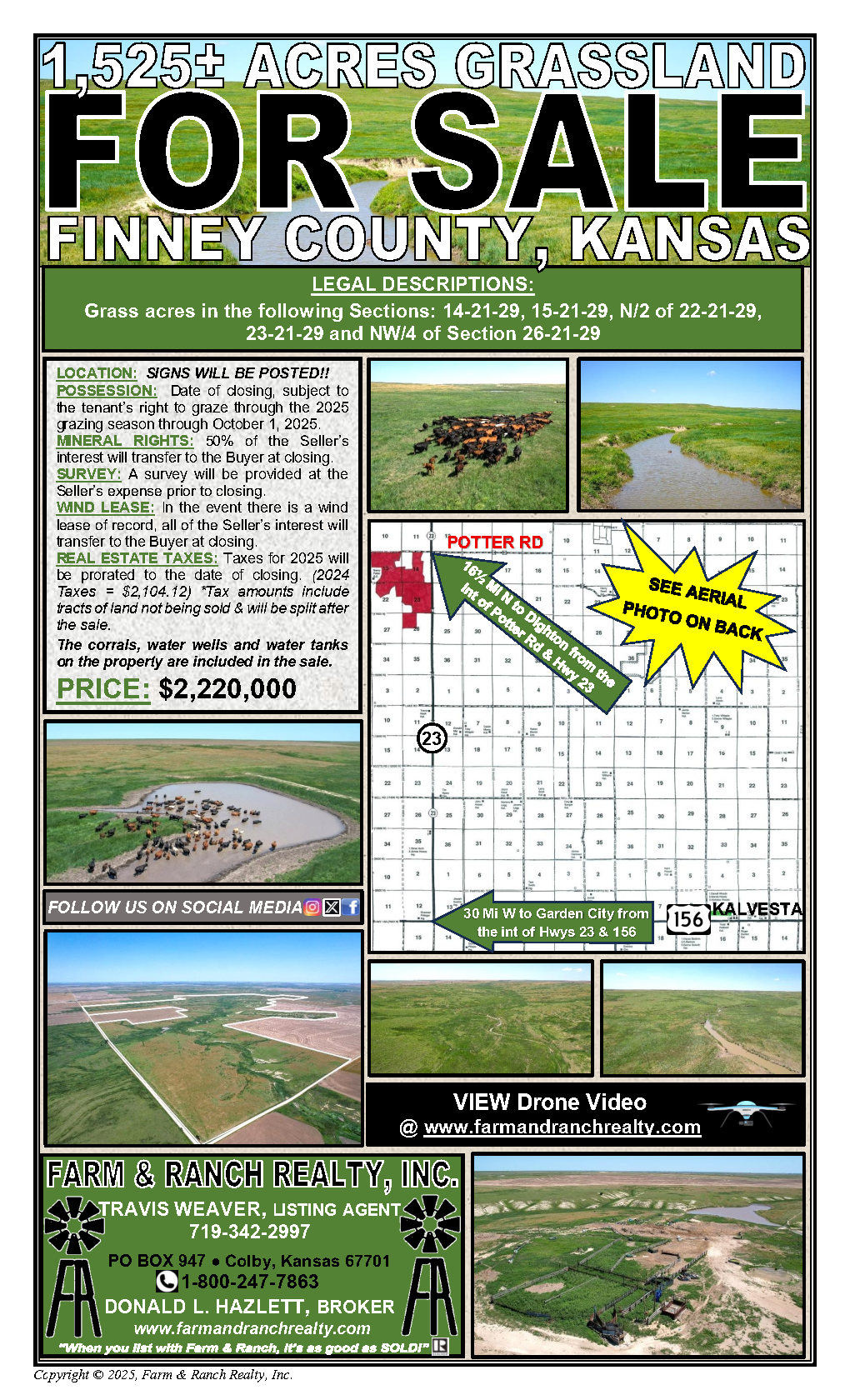 1,525 acres of well-maintained grassland for sale in Finney County, Kansas. This excellent grazing property includes corrals, water wells, and water tanks, all of which are included in the sale. Possession will be granted at closing, subject to the current tenant's right to graze through the 2025 grazing season, ending October 1, 2025. A survey will be provided at the seller's expense prior to closing. Fifty percent of the seller's owned mineral interest will transfer to the buyer at closing, along with any wind lease interest of record. Real estate taxes for 2025 will be prorated to the date of closing; 2024 taxes were $2,104.12 and include additional tracts not included in the sale-final amounts will be split accordingly. Signs will be posted on-site for easy identification. For more information, contact listing agent, Travis Weaver, at 719-342-2997 or Farm & Ranch Realty, Inc. at 1-800-247-7863.