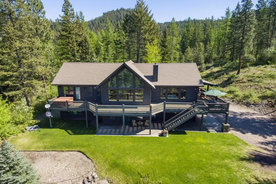 Located on 7.10 acres, this rustic Montana home is just minutes south of Bigfork Montana and offers complete and absolute privacy. With custom built, timber-frame features, this home is nestled in a quiet wooded setting with no neighbors in site. Located on a paved road in a gated community, the house has frontage on Hunger Creek and offers a beautiful mixture of trees, including cedars, firs and tamaracks. Inside the home, you will find rough sawn wood beams, expansive fir & larch flooring, a main level master suite with deck access, and a chef's kitchen, complete with butcher block island and Thermador range and double ovens. The partially covered deck surrounds 3/4 of the house and creates the perfect outdoor entertaining atmosphere. The lower walkout level offers a large living area, two guest bedrooms and a spacious full bath. With gently rolling land that has been parked out an...