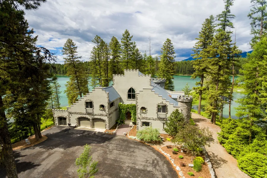 Castle on the Lake! Inspired by European castle design, this stunning one of a kind home has frontage on pristine, spring-fed Lake of the Woods, and incredible views of the Swan Mountains. Built in 1998, with 4200+ majestic square feet, four bedroom suites, gourmet kitchen with top-of-the-line appliances, breakfast nook, formal dining room and great room, media room, and more in this masterpiece of whimsical and enchanted design. Main level master suite has an expansive master bath with dressing room, large walk in closet. Exquisite interior finishes throughout, floor to ceiling stone fireplace in the great room, Interior great room beams are reclaimed from the historic Elkhorn Mine. Large attached garage, storage shop, artist studio, and a few enchanted surprises and passageways too!