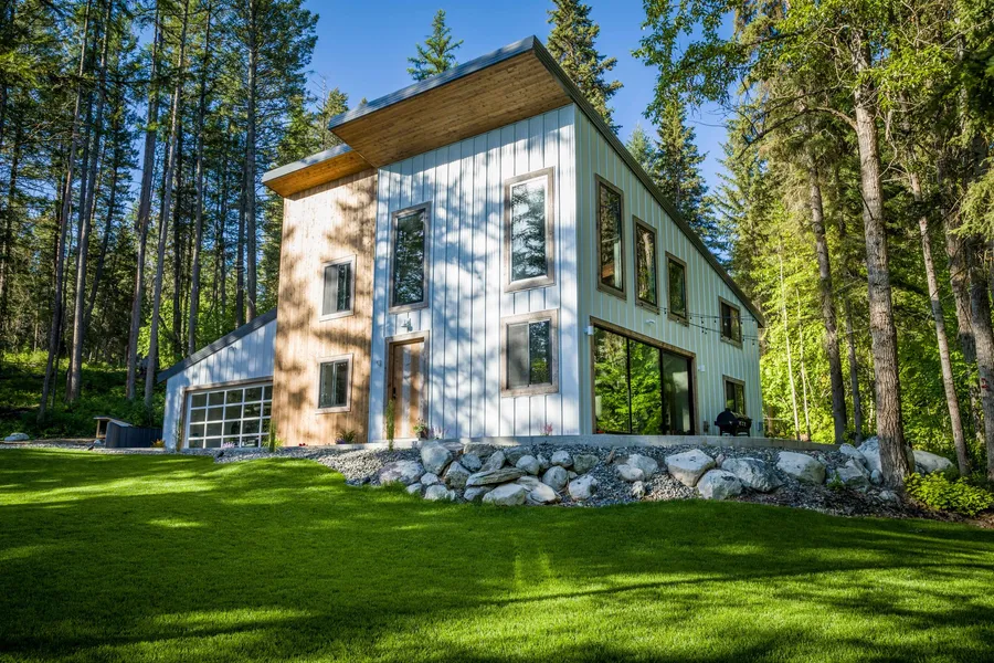 Urban Modern Home located two minutes from the shore of Flathead Lake and 15 minutes from Kalispell. This four bedroom/three bath home is a designated smart home.Outdoor living area is steps from the year-round creek that winds along the northern border of the 2.73 wooded and manicured acreage. A custom 18' glass wall in the living room opens to bring the outside in. The nest thermostats & smoke alarms send an alert to the owner. WIFI operated wall oven, modern white cabinets & marble counters highlight the spacious kitchen. Radiant floor heat on the main level and garage. Custom 18' garage door with insulated glass panels. Exterior features - WIFI security camera & irrigation system, paved driveway, concrete sidewalk & paved driveway. Siding is standing seam metal with a wood