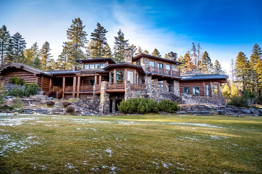 Expansive views from each room define this custom log home on 5 acres above Whitefish with dramatic arrival rock walls and landscaping. Large gourmet kitchen with ample counter space and cozy breakfast area with fireplace, plus a formal dining room overlooking the patio and lush lawn. The intimate main living area expands the view north to the Big Mountain and east to Glacier Park. Four guest bedrooms on the main floor provide lavish guest quarters, while the entire upper level is devoted to the master suite and study. Take the stairs one more level up to the covered cupola deck with Glacier and lake views. Tile and hardwood floors throughout, 3-car garage with extra height, 5,800 sf living area plus basement with one additional bedroom & bath and over 1,000 sf storage.