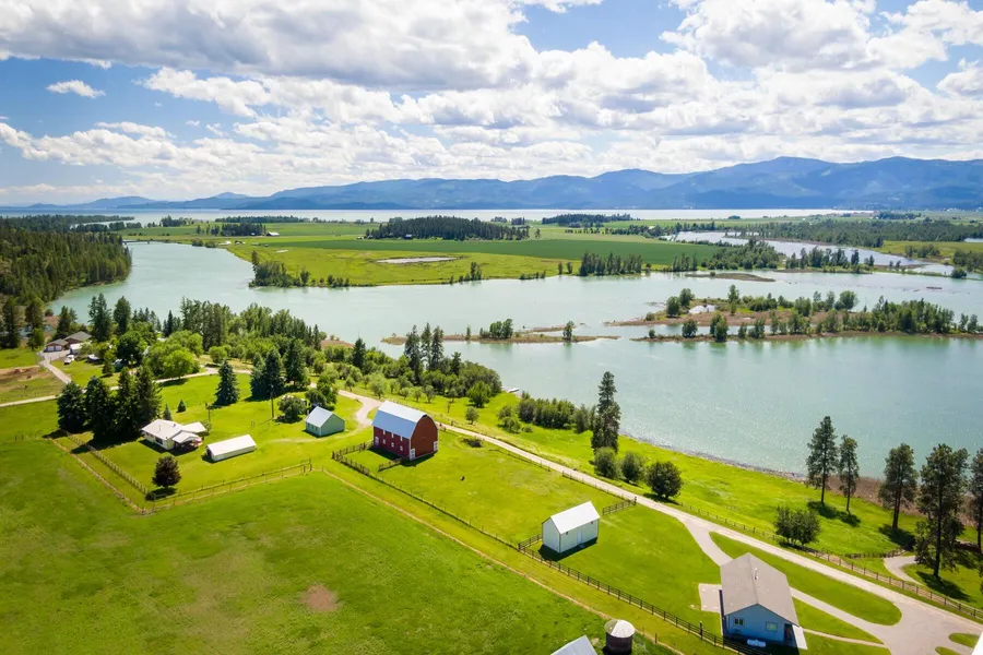 Montana living at it's finest. Located minutes north of Bigfork, this special waterfront property consists of 14+ acres with 700+ feet of Swim Creek frontage, a protected inlet providing direct access to the Flathead River & nearby Flathead Lake. Perched on a west-facing ridge with spectacular views of the Flathead waterways & Montana sunsets; the residence, 3,800 sq ft shop & refurbished barn also capture views of the Swan Mountains to the east. The residence is small but expertly maintanained with 2 bedrooms, 1 bath open living room, kitchen, dining area & a wonderful covered porch. There's a 2 stall barn for horses, & an amazing additional bldg site. The shop consists of 1 large bay & 2 smaller areas for storing a multitiude of equipment, vehicles, boats, jet skis & back country toys.