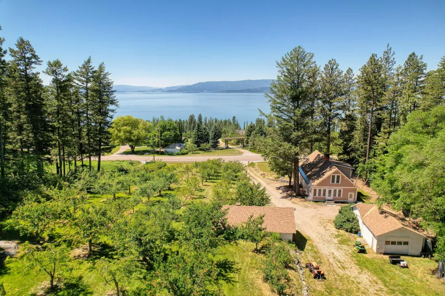 East Lakeshore home and Orchard with wonderful Flathead Lake views. Older home that has been remodeled over the years. Boarders Forest Service. Canning kitchen in the basement. There is a garage and then an older shop that is used for the orchard primarily.Working orchard with outside help in maintaining, there are 167 Cherry Trees, including lapkins and bings. There are several kinds of peach, 5 apricot, 17 plums, 14 lodi apples, 4 nectarines and 7 pears trees. Also a blueberry patch with fabulous fruit, raspberries and blackberries. Much of the fruit is sold to farmers market and past customers.The orchard is irrigated with water from Henry's Creek, sellers drilled a well a few years ago that now services the house. Great area above with bigger views to build a new home.