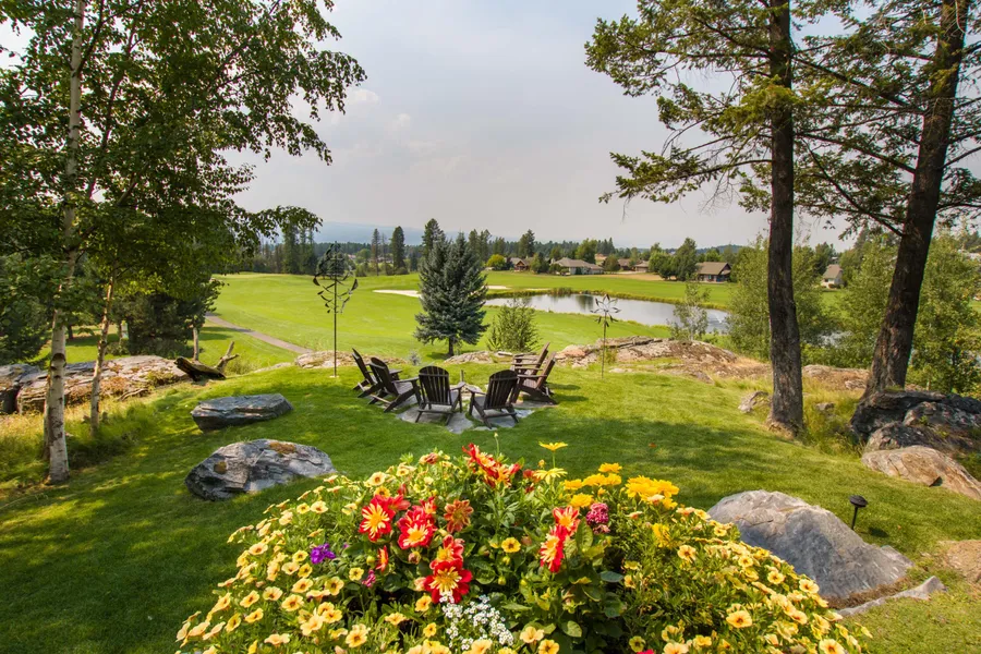 A wonderful opportunity to own one of Bigfork's premier residences. Strategically located at the end of a cul-de-sac on 4 elevated lots overlooking the 3rd fairway of the Eagle Bend Golf Course. The impeccable design consists of expansive main floor living with an impressive master suite, spacious office, designer kitchen with breakfast atrium, captivating living room under beamed & vaulted wood accent ceilings. Intricate iron & fine glass work compliment the thoughtful floor plan & highlight the stately entry & stairway to the enticing lower level. The gathering room & one of two large guest suites are accentuated by beautiful rock fireplaces. There are many outdoor living spaces, walkways, fire pit & decks all enhancing this wonderful setting.