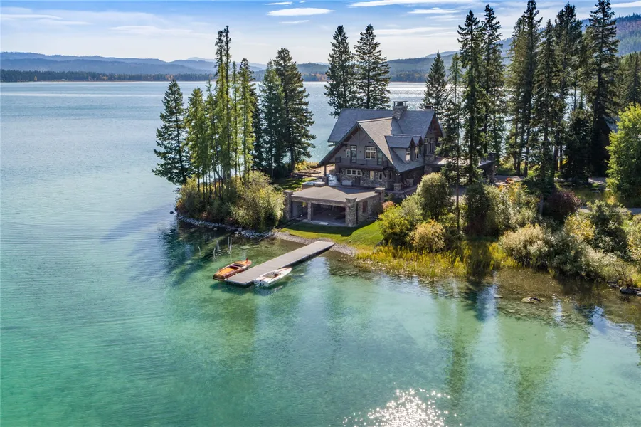 Embrace the extraordinary. Welcome to "Stonegate." a hidden gem nestled on a serene lake in northwestern Montana, sitting on an expansive 768-acres, offering the perfect blend of seclusion and convenience with easy access to the amenities of Flathead Valley. Inspired by the Prince of Wales in Waterton Lakes, Stonegate is more than just a property; it's a destination designed for gathering and enjoying the best of Montana's recreational activities. Whether it's skiing, snowshoeing, horseback riding, hunting, water sports, fly fishing, or simply savoring a cozy night by the fire, Stonegate offers it all. Enjoy a game of pool, drinks at the bar, or the breathtaking sight of the moon rising over the lake on a starlit night. The centerpiece of Stonegate is the magnificent 8,209-square-foot main lodge, situated on 1,135 feet of pristine waterfront. This exquisite structure reflects the timeless heritage of a mountain lodge, featuring luxurious living spaces that seamlessly blend rustic charm with modern comfort. Stonegate's property includes companion dwellings and amenities: Guest house, 1,320-square-foot, two-bedroom guest house perfect for visitors; Original homestead cabin, a charming reminder of the property's rich history; Boathouse, ideal for storing watercraft and enjoying the lake; Horse barn, a well-equipped facility for equestrian enthusiasts; Heated shops, two spacious, heated shops for various needs and hobbies. Stonegate is not just a home; it's an unparalleled lifestyle experience. Every detail has been meticulously curated to offer the ultimate in comfort, luxury, and outdoor adventure. From its stunning architectural design to the vast array of activities available within its boundaries, Stonegate stands as a testament to Montana's majestic beauty and boundless possibilities.