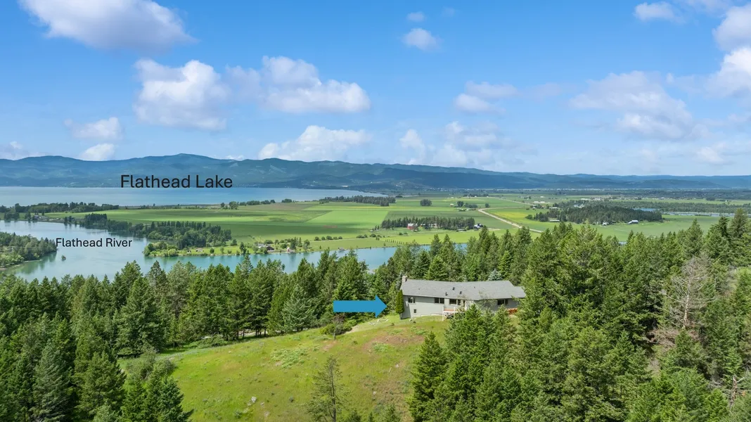 Welcome to an exceptional opportunity in the picturesque town of Bigfork, Montana. This unique, custom-built home, available for the first time on the market, is nestled on just over an acre of lush Montana land, offering unparalleled views of the renowned Flathead Lake, Flathead River, and the breathtaking Swan Mountain range. Spanning 4,171 square feet, this one-of-a-kind residence features 3 bedrooms, 3 baths, and an abundance of natural light streaming through multiple windows throughout. The primary suite is located on the main level featuring a large walk-in closet with two 3/4 bathrooms, perfect for individual space. Conveniently located across from the closet is a private laundry room, complete with built-ins and a sink. Additional main level highlights are an expansive living room with vaulted ceilings, adorned with wood beams, creating an airy and spacious feel overlooking the blue aqua waters Flathead Lake.