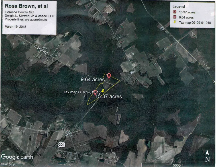 The tracts are located at the intersection of S. Hill Road and US Hwy. 301 (Olanta Highway). The tracts can be purchased together or separately. Tract A has a dwelling on it. The house is in fair to poor condition and buyer should inspect the house. No warranty or guarantee of condition is offered by the Sellers or their agent, Dwight L. Stewart, Jr. Total estimated timber value is $10,000 on Block A and $11,000 on Block B. copies of stock and stand tables for the estimated timber volumes are available on request. A new plat of both tracts was completed in September, 2017.