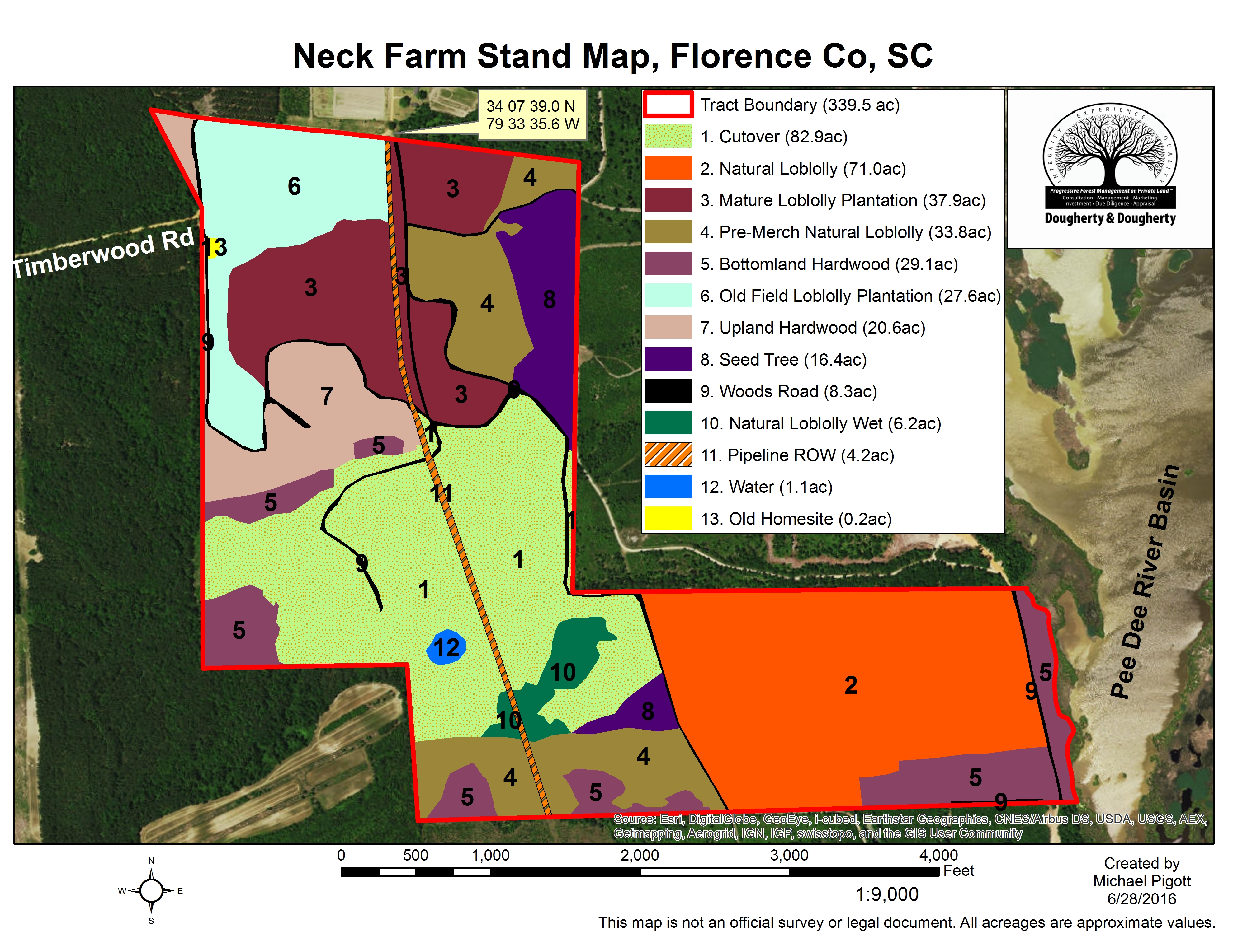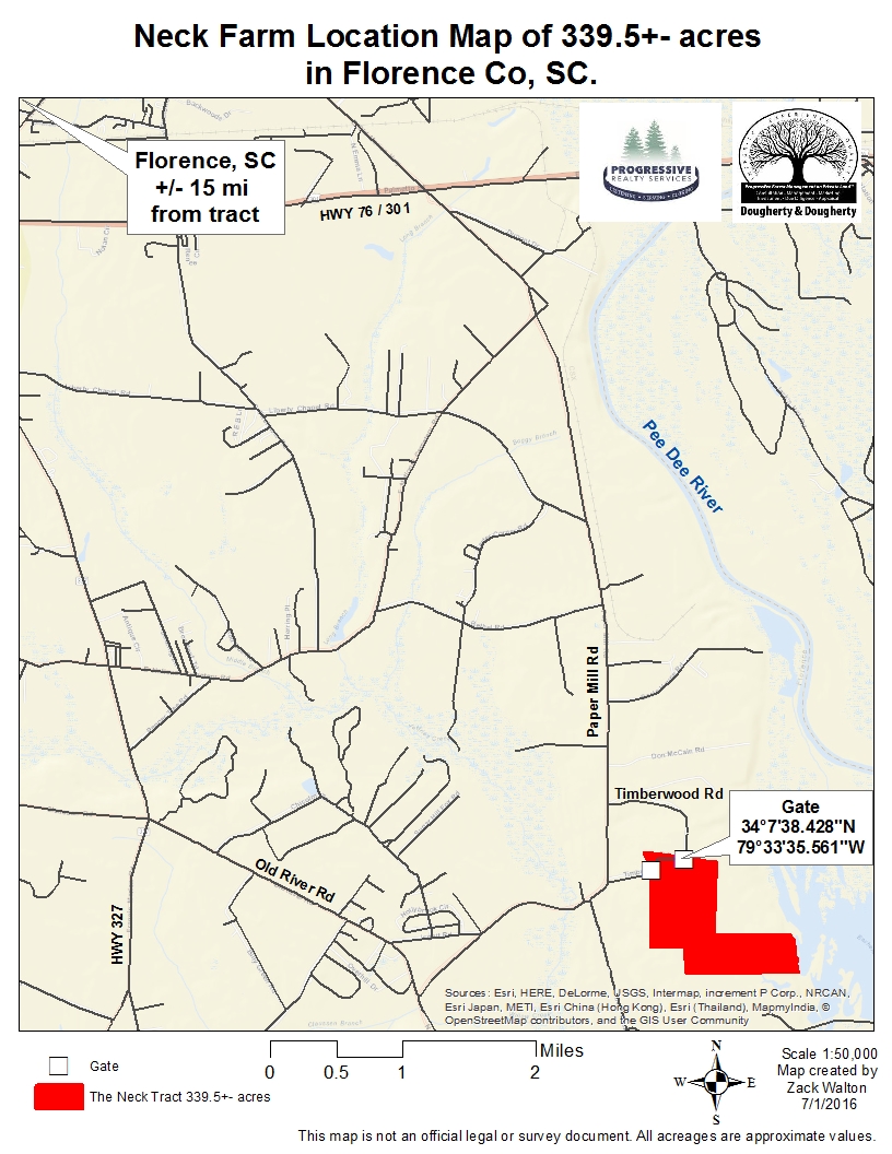 The Neck Farm is located in the popular and historic Pee Dee Region of South Carolina, named for the large Pee Dee River that is just east of the Neck Farm. The property is located just 8 miles from Francis Marion University and 15 miles from Downtown Florence. The property is 62 miles from Myrtle Beach, 72 miles from Pawleys Island, 100 miles from the state capital, and 110 miles from Charleston. The property is located approximately 15 miles from Exit 170 (Hwy 327) on I-95. I-20 originates at Florence and the developing I-74 will be just a few miles east of the Neck Farm. Major State Hwy 76, running from Florence and Marion, SC, runs just north of the property. The Neck Farm fronts on Timberwood Road, just off of Paper Mill Road. Access to the interior of the property is provided by a working woods road and system of woods paths.
