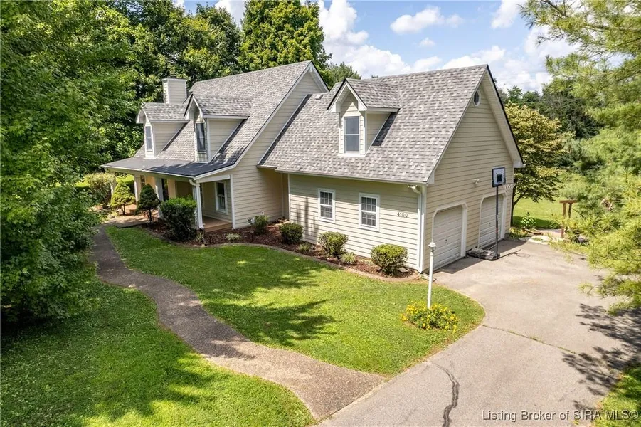 Floyds Knobs! Home with almost 8 private acres for kids to explore, play sports, enjoy the outdoors, raise chickens, garden and more! Welcome to this private & inviting Cape Cod-style home offering 3 Bedrooms including 2 Main Bedroom Suites and 3 1/2 bathrooms. The bonus room on the second floor could possibly be a 4th bedroom. Spacious foyer features a soaring ceiling w/shiplap & glass pane doors! Living Room features a wood burning fireplace! The Dining room adjoins the Kitchen which opens onto a rear enclosed porch overlooking the beautiful rear acreage! Barn with blue tin roof currently being used for storage has lots of possibilities. A small, detached shed behind the house offers lots of options (previous owner had hot tub there.) Multiple decks. 2 car attached garage. Enjoy the best of country living! Newer Roof & exterior Siding. 1 year 2-10 Home Warranty provided. Nestled in a p...