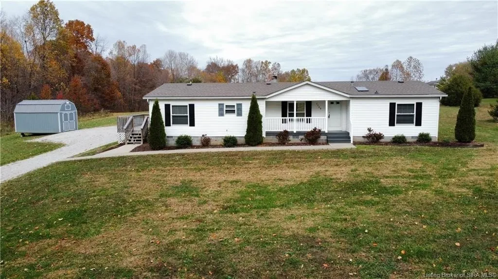 Peaceful living at this home in Lanesville! Greeted by a covered front porch, perfect for watching nature or having your morning or evening beverage of choice, you will love this modern double-wide home! Spacious living room, open, bright, vaulted ceiling, with a corner wood stove. The kitchen is to the left with ample cabinetry and countertop space! A nice pantry, too! Nice dining area with two windows. Laundry room by the back door. Split bedroom floorplan. Primary bedroom with a HUGE walk-in closet and a nice primary bathroom with a step-in shower. Two additional bedrooms with great closets! Hall full bathroom with tile shower surround above the bathtub. The sliding glass door from the living room leads to a wonderful patio space. The side entry door has a deck and leads to the gravel drive. Plenty of room to park your vehicles! A well-built shed to house your lawn equipment is on site, too! The seller has done some nice upgrades throughout the home. Crawlspace work, dirt work, replaced skylight, and more! With just over an acre lot to enjoy, call today and schedule your private showing! Seller had to relocate after owning just over a year; she is sad to have left! HVAC and water heater are about 5 years old, and the roof is about 4 years old.