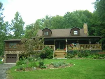 Quality built log home in a private rural setting. Features 6 bedrooms with 3 on the main level. Has 4 full baths and 1 half bath. Has exposed beams, large stone fireplace, wrap around porch, hardwood floors, custom cabinets and countertops, ceramic tile baths, skylights, balcony, and more! Secluded 7.66 acre tract with nice stream, pond, and a small log guest cottage!