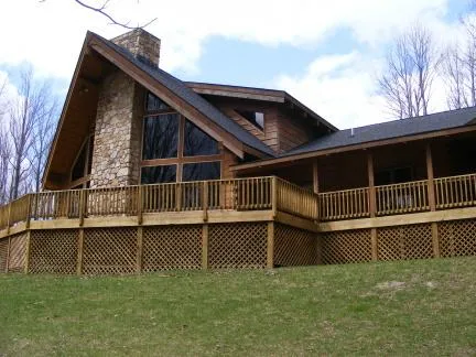 This high quality log home features a large wrap around porch and deck. Large stone fireplace, recessed lighting, vaulted ceilings, interior and exterior balcony, hardwood and tile flooring. Features a large master bedroom with private bath. Double detached garage with half bath and finished upper level that can be used as a recreation or game room. The 43 acres of wooded land makes this property a marvelously secluded retreat with easy commute to town.