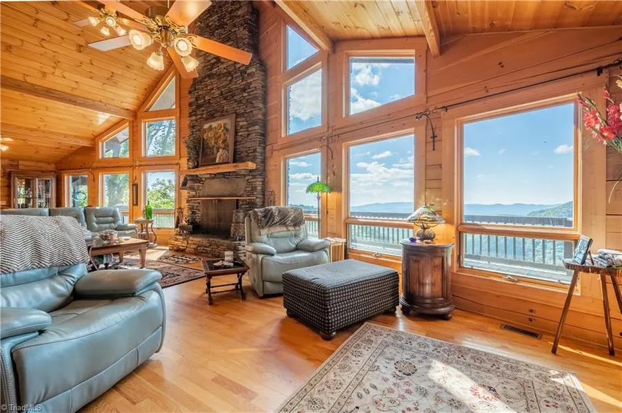 This beautiful custom-built log home is nestled on over 100 acres right off of the Blue Ridge Parkway with sweeping magnificent views. Only 6 miles to FLOYD, Va. 2-850ft deep wells & 50ft underground line to a 1000 gallon spring water holding tank, switchable between wells or spring water. A whole house generator, tankless water heater, leaf guards, metal roof. A heated RV barn with plumbing and septic, and two other sheds for a tractor and equipment. The basement boasts a custom built wine cellar and canning room with thick cement walls. Load firewood on to an outside elevator right to a covered holding box to feed the 42 ft. stone fireplace. 2 HVAC's 5 and 2 years old. 2-1000 LP gas tanks. Sit in the hot tub and take in the views and privacy. Don't let this beautiful property get away from you! Please do not drive up the owner's driveway! 101 acres includes 4 parcels in Patrick County ...