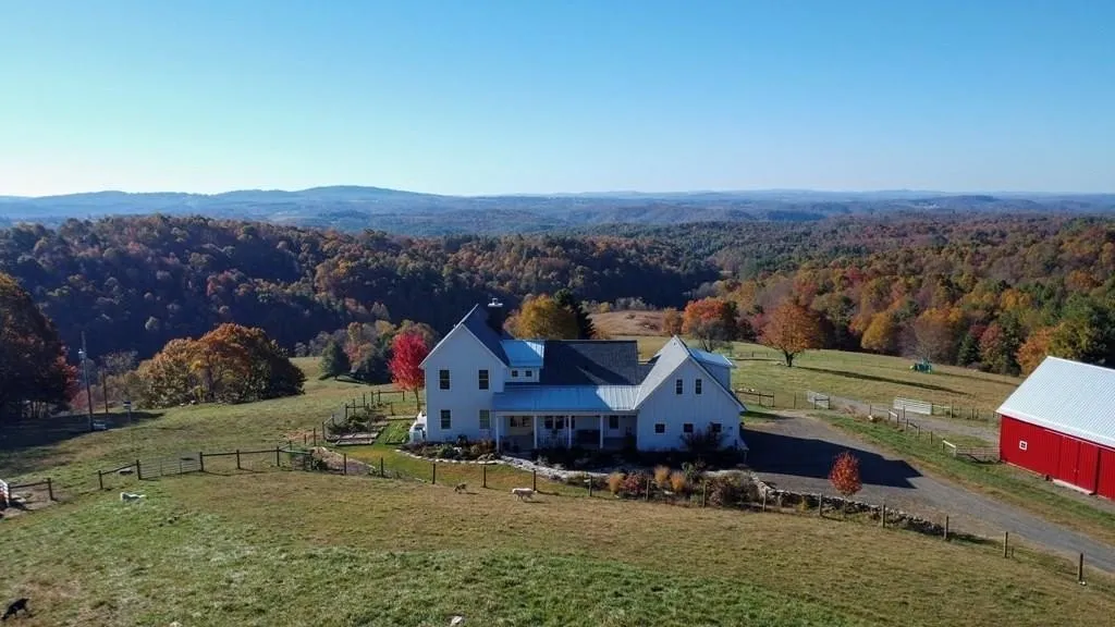This exceptional custom-built farmhouse has been thoughtfully designed to maximize panoramic long-range views. The 4 bedroom/3.5 bath home includes open-concept living/dining/kitchen area, guest apartment with kitchenette, bonus room, and den. Situated at an elevation of 2,940 feet, the home is set on a private, expansive 77-acre property with frontage on two well-maintained roads. A charming flagstone path and stone wall lead to a spacious front porch, perfect for rocking chairs and dining while enjoying the garden. Inside, the home features 9' ceilings, locally-milled white oak floors, shiplap, timber beams, tongue-and-groove ceilings, and a TN fieldstone fireplace. Unique touches include transom windows, custom-built cabinetry, cozy reading/sleeping nook, custom kitchen with seeded glass doors, granite countertops, TREX deck, stone patio, 6-person spa, and raised beds and edible perennials in the side yard. Six watered pastures are connected by roadways that meander through woodlands inviting you to explore on foot or ATV. The entire farm is fenced and cross-fenced with woven wire and includes a 36x48' barn built in 2021, separate hay barn, chicken coop, and animal shelters in each paddock. Four spring-fed streams flow year-round and a fully-stocked pond with 12x12' TREX platform dock for swimming/fishing enhance the property's beauty and recreation opportunities. Centrally located within 30 minutes of Floyd, Christiansburg, Radford, and the Blue Ridge Parkway, this property is truly a must-see! Private showings are by appointment only, with a 2-hour notice requested when possible. Call today to schedule your tour!