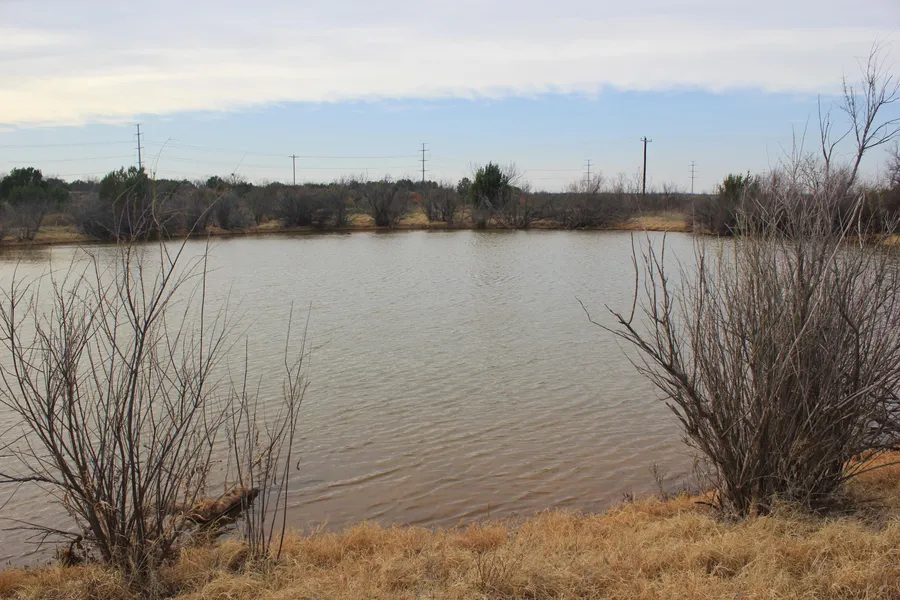 The pasture has a bit of a roll to it, with lots of cedars and mesquite trees and a really nice water tank in the bottom, about a half acre in size. Per the owner, this tank is spring fed and never went dry during the drought several years ago. (You can see evidence of a spring behind the dam.) It would be perfect for stocking with fish and provides good place for dove hunting too.