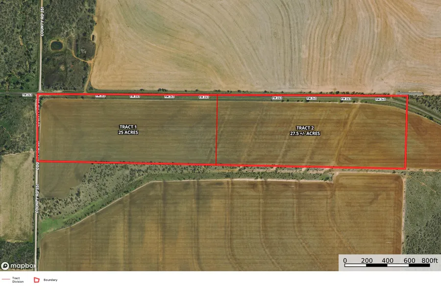 This land is located 3.2 miles west of Hwy 6 in Foard County, TX, south of Crowell near Foard City. It is cultivated ground, being offered as two tracts - Tract 1 (25 acres) and Tract 2 (27.5 +/- acres). Both are listed for $2,380/acre.