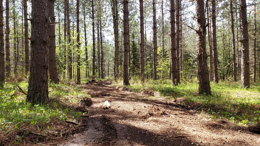 This is gorgeous land wooded with Norway Pine, birch, fir, popple, and maple over a gently rolling topography. It's big and very private with room to hunt if you wish. Additionally, the seller has staked all corners and flagged the sideline. He also hired a professional service to clear a wide trail from the road to the back of this land, making it easy to walk throughout this acreage.
