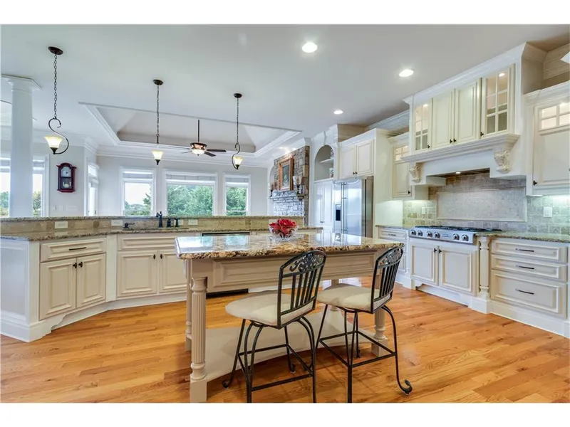 Exquisite European style 4 bed 4.5 bath master on main in Stoney Point Farms has been meticulously maintained. Located in South Forsyth High district, this home features an open kitchen with views into the fireside keeping room. Gleaming hardwood floors throughout the entire home. Freshly Painted Interior. Master bedroom features a sitting area and access to the deck. The master BA is large w/a spacious tile shower. 3 large en-suite bedrooms upstairs with tile showers and large walk-in closets. Full unfinished daylight terrace level features 12+ ceilings. A must see!