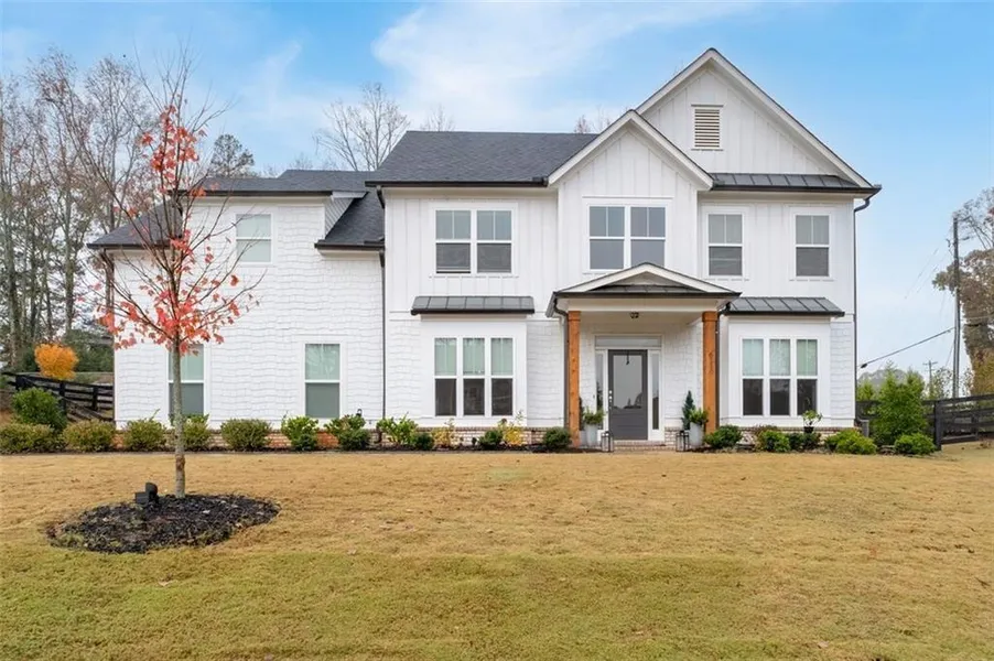 This stunning, custom-built 2021 farmhouse offers the perfect blend of modern elegance and classic southern charm. The open-concept main level boasts abundant natural light, beautiful hardwood floors, and stylish design elements like barn doors, chic lighting, a cedar mantel, and built-in shelving. The gourmet kitchen is an entertainer's dream, featuring quartz countertops, an oversized island, double ovens, a 5-burner gas cooktop with vent hood, a farmhouse sink, and pantry. The living room can be closed off for privacy with a beautiful barn door, and the large inviting dining room will seat many guests comfortably. A guest bedroom with office potential and a half bath complete the first floor. Off of the kitchen, you will find a large laundry room with sink, a two car garage and separate single garage, that would be great for a workshop or exercise room. Upstairs, the luxurious primary suite offers ample space for a sitting area, a spa-like bathroom with a large shower, soaking tub, dual vanities, and walk-in closets. Three additional bedrooms, each with a walk-in closet, and two full bathrooms provide comfortable accommodations for family and guests. Located just minutes from Vickery Village for great shopping & dining, and in the Award Winning Forsyth County School System. This home offers the best of both worlds: serene country living and convenient city access.