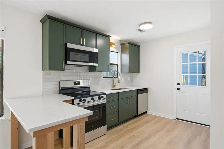 Welcome to this charming bungalow by Lake Lanier! This beautifully updated home has been completely transformed from top to bottom, featuring new cabinets, stunning quartz countertops, and stainless steel appliances. Enjoy the elegance of LVP flooring throughout, complemented by a cozy custom electric fireplace with floating shelves. The bathroom has been thoughtfully renovated, showcasing a gorgeous custom tile shower. A new driveway leads you to the welcoming front porch, and the home also includes a convenient carport. This home has so much to offer. Just move right in! It is walking distance to Lake Lanier, shops, and restaurants, this is a true gem that you won't want to miss!