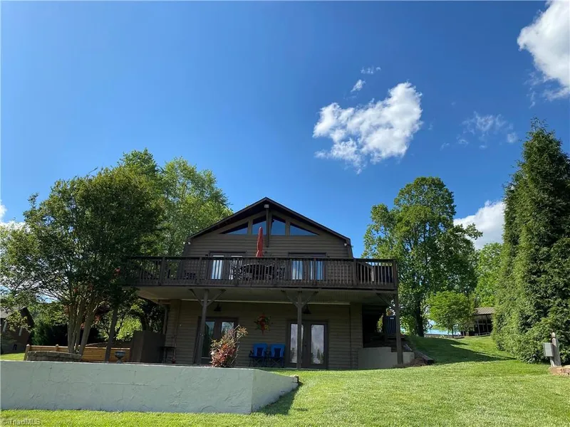 Lakefront on Belews Lake!! This home is lovingly maintained interior and exterior. Vaulted wood beam ceiling in living room. Gorgeous rock fireplace with gas logs and wood flooring. Stunning view of lake from living room and dining area. Convenient kitchen with granite counter, tile backsplash, recent range/oven, and tile floor. Spacious primary bedroom on main level with new carpet. Updated bath with granite counter, vanity, and bronze fixtures. The lower den is great for entertaining and leads to patio for extra living space. Deck has been reinforced underneath and added fiberglass rain panels. Huge laundry room with shelving. Dock has power and water. 2 car attached garage. This home also offers cover for boat or camper. The landscaping is beautiful. 2 car attached garage with paved drive. Nice outbuilding and covered space for boat, camper, etc. The views are simply stunning from upp...