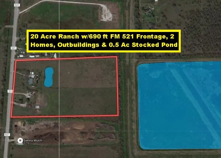 Just Reduced! Ag Exempt! 20 Acre Ranch has 2 Homes, Outbuildings, 0.5 Acre Stocked Pond & 690 ft FM 521 Frontage. Located at 9379 & 9401 FM 521. Can be subdivided into Home/10 Ac. See Pics for Details! Close to SH6, SH288 & Prop. SH99. Minutes to Pearland Town Center. 23 miles TX Medical Center & 30 to Downtown Houston/Hobby Airport. Contact Capital Farm Credit for Loan! Can Be Commercial! Perfect for Residential Development, Horse Sanctuary, Church, Company Retreat, RV Park, B&B, Retail Store or Office/Warehouses. The Grand Parkway/TX-99 will be 180+ miles & connect League City-Rosharon-Katy-Tomball-Baytown (See Maps)! 4198 Total sqft includes 2424 sqft 4/2 Home at 9379 FM 521 & 1774 sqft 3/2 Home at 9401 FM 521. Can be subdivided into Home/10 Acres. Verify Restrictions! See Virtual Tour, Plat & Floor Plans in Docs!
