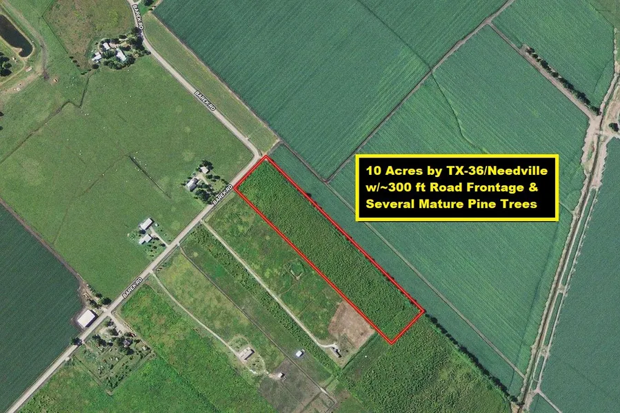 10 Acres by TX-36 & Needville with 300 ft Road Frontage & Several Mature Pine Trees. Property is Surrounded by Hundreds of Acres of Farmland & has Beautiful Views of Growing Crops, Lush Pastures & Mature Trees. Needs Well & Septic. 20 Miles to US-59/I-69 & TX-99/The Grand Parkway. Easy Commute to Schools, Shopping & Downtown Needville & Sugar Land. TX-99/The Grand Pkwy (Houston's 3rd Loop) will span 180+ Miles from League City-Rosharon-Katy-Tomball-Baytown when finished (See Map)! 25 Miles to TX-288 & Sugar Land. 30 Miles to Angleton & Lake Jackson. 45 Miles to TX Medical Center/Downtown Houston & The Gulf/Surfside Beach. Contact Texas Farm Credit for Loan! Property is Not Located in Flood Plain. Verify Restrictions.