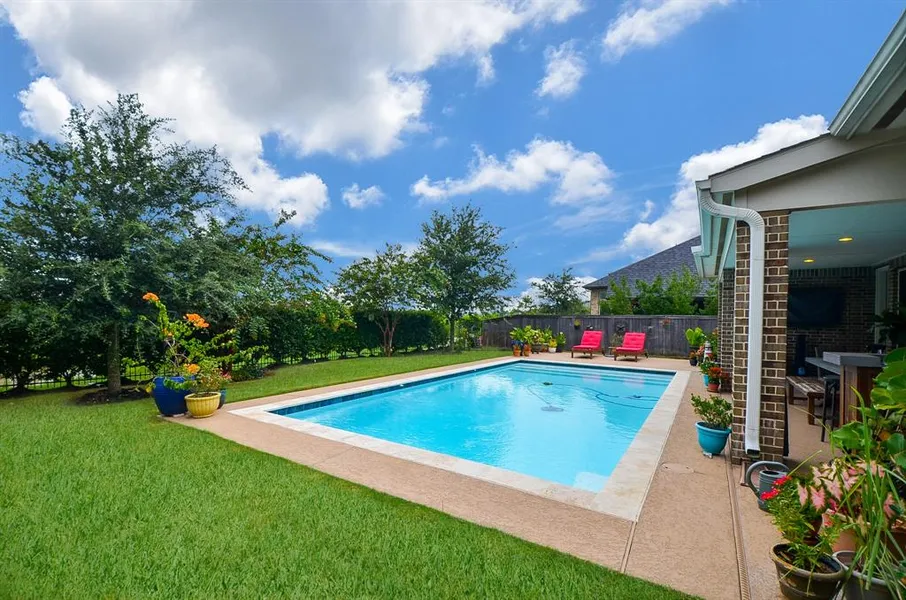 Fabulous 2 story Perry Home with an elegant curved stairways as one enters this gorgeous home, high ceilings and big windows to allow lots of natural lighting; a nice floor plan with 2 bedrooms downstairs - huge master with double vanity sinks, separate tub & shower and with spacious walk-in closet and a guest "in-laws" suite with a full bath and walk-in shower; 3 upstairs secondary bedrooms and a total of 4 and one half baths, & a pool with no back neighbors for your private enjoyment. Spacious big island kitchen with recently installed Quartz countertop which opens to the family room. Kitchen comes with lots of cabinet space, gas cooktop and a walk-in pantry. Work from home in the study with French doors overlooking the front yard. Huge upstairs gameroom next to the media room; media projector, speakers and screen stays. The backyard oasis features an extended covered patio, a luxurious pool and still have ample green yard space. All measurements are approximate & should be verified.
