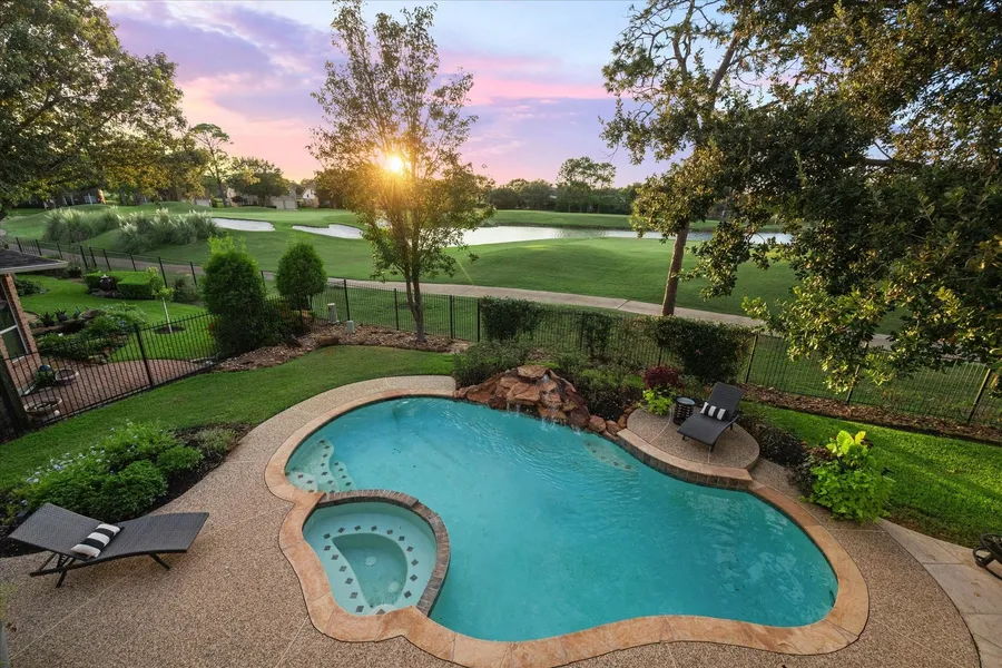 Experience luxury living in this exquisite 5-bedroom, 4.5-bathroom home located in the highly desirable golf course community of Falcon Point Estates! Enjoy a beautiful backyard with stunning views of the fairway and 5th hole. Perfect for entertaining, this home features an upgraded kitchen that opens to the family room with a double-sided fireplace, extending into an extra room perfect for entertaining. French doors leading to the covered patio, pool, and spa. The primary bedroom offers its own fireplace, a cozy sitting area, and a balcony overlooking the pool and golf course. The large primary bath boasts a soaking tub, a separate shower, and double vanities. A fifth bedroom downstairs provides convenience and comfort for your guests. Recently installes laminate hardwood floors and carpet. Fresh paint throughout. Updated kitchen with quartz countertops. Quick access to both 1-10 and 99. KATY ISD exemplary schools!