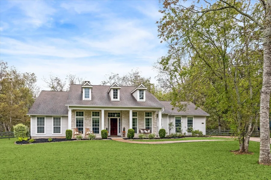 This charming one story home sits on 1.3 acres! Wide front porch overlooks oak tree grove for a relaxing, peaceful view. Plenty of privacy in the backyard with beautiful pecan trees and oversized wrap around patio that has been recently added along with a covered patio. Home has a modern farm house charm with updates throughout. Open gourmet kitchen features brick hearth with a Bosch five burner stove and double ovens that opens to the dramatic Family Room which features extensive crown molding, fireplace, and a wall of windows overlooking the exceptional wooded backyard Primary suite has sitting area with quad windows and a door that leads to patio, recently updated bathroom with modern finishes that won't disappoint, which include custom vanity, subway tiles and shiplap. Home is light and bright and offers quality upgrades throughout the home. Great location in stunning neighborhood!