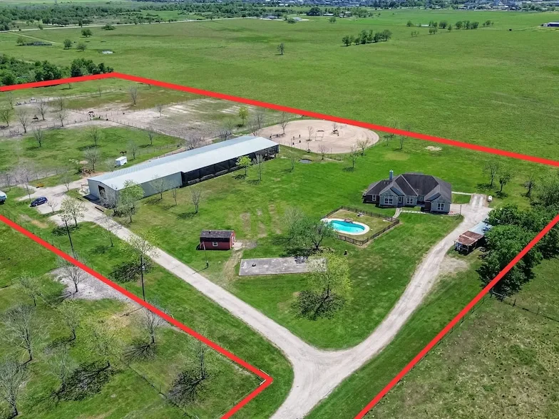 Welcome to this stunning equestrian estate on 13.15 acres which offers everything you need for luxury country living with top-tier horse amenities. The horse facilities include safe fencing, a 15-stall barn, tack and feed rooms, a wash rack, round pens, and a lit, covered arena with screens perfect for year-round riding. Enjoy warm Texas evenings by the sparkling swimming pool or take in the breathtaking sunsets. The custom home features an open-concept layout that seamlessly connects the kitchen and living area. The kitchen boasts granite countertops, a brick-accented stove surround, high-low island with black carbon sink, and custom cabinetry. Recessed lighting enhances the living room, kitchen, and spacious primary suite, which also features a coffered ceiling. The luxurious primary bath offers dual vanities, a jetted tub, and separate shower, while the oversized closet includes a built-in safe and hidden nook. Upstairs, enjoy a dedicated media and game room.