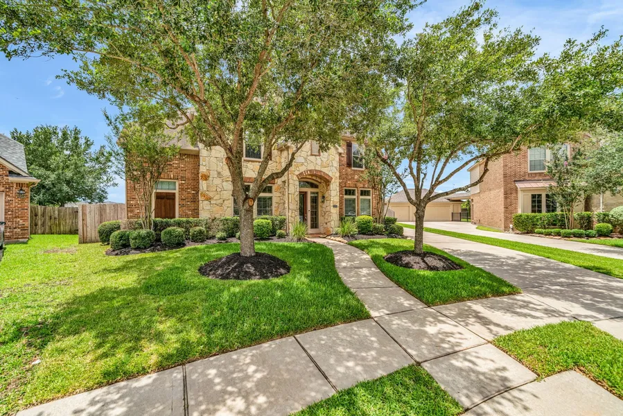 Stunning Perry Home in Cinco Ranch showcasing a classic brick-and-stone exterior and a grand two-story entry flanked by a formal dining room and private study with rich wood floors. The spacious family room is filled with natural light from a wall of windows and features a cast-stone corner fireplace. The island kitchen offers granite countertops and GE stainless steel appliances leading to the dining and living areas with serene backyard views. The primary suite is a retreat with floor-to-ceiling windows and a fully remodeled ensuite with a garden tub, frameless glass shower, dual vanities, and a generous walk-in closet. Upstairs includes three spacious bedrooms and a game room. Enjoy a large back patio with no rear neighbors, a 3-car detached garage with a 5-ft extension and floored attic, plus two tankless water heaters for efficiency. Zoned to award-winning Katy ISD schools with direct access to walking trails, lakes, pools, tennis courts, shopping, dining, and more!