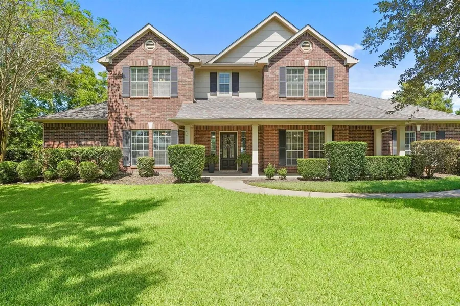 Set on over 1 acre of wooded lot, this traditional two-story residence offers 3,414 sq/ft of living space with 5 bedrooms, 3 full baths, a billiard room, game room, and attached/detached garages. A welcoming front porch opens into bright interiors with high ceilings, beautiful floors, and three sided fireplaces anchoring the main living spaces. The kitchen features marble counters, gas cooktop, built-in oven, and an oversized island that flows to the breakfast nook and family room. The downstairs primary suite includes a spa-like bath with dual sinks, soaking tub, and shower. Upstairs, a spacious game room and secondary bedrooms provide versatility for family or guests. Outdoors, enjoy a covered patio, fully fenced yard, sprinkler system, and mature trees offering privacy. The detached garage apartment quarters have a living area and kitchen. Located in Huntington Oaks, this property combines acreage living with easy access to major highways, shopping, and top Lamar schools.