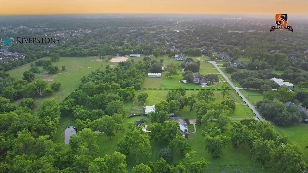 Enjoy the finest of town & country living on this magnificent 9.405-acre wooded estate nestled between Sweetwater & Riverstone. Drive down Palm Royale Blvd, past Sweetwater Country Club, and within minutes find yourself in the bucolic treasure of Maranatha Farms. 3706 Maranatha is the premier lot within the neighborhood, comprising 5.6431 acres within Maranatha Farms HOA & 3.7619 contiguous unrestricted acres. The picturesque property features beautiful pecan woods with abundant landscape lighting. The southern views are enchanting, without another rooftop in sight. Estate home has excellent floor plan and timeless aesthetic. Barn & cross fencing are ready for use for horses or other farm animals. Spacious guest house w/private deck overlooking lovely fishing pond. This serene estate feels worlds away, yet is minutes from Sweetwater Country Club & all the amenities of the pristine master-planned communities of Riverstone & First Colony.