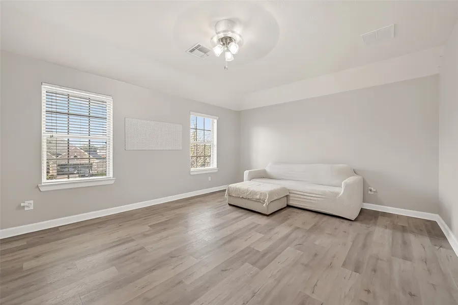 Beautifully maintained two-story home with an open, versatile layout and multiple living areas. The main level features a front living space, dedicated dining area, and spacious kitchen with extended countertops, center island, pantry, and ample cabinetry, seamlessly connecting to a second living area and breakfast space overlooking the backyard. The primary suite is located on the main level and offers large windows and a private ensuite bath with dual vanities, soaking tub, and separate shower. Upstairs includes a flexible family room, three additional bedrooms, a dedicated home office, two full baths, and a half bath. Enjoy outdoor living with a covered patio and fully fenced backyard. Bright, functional, and ideal for everyday living and entertaining.