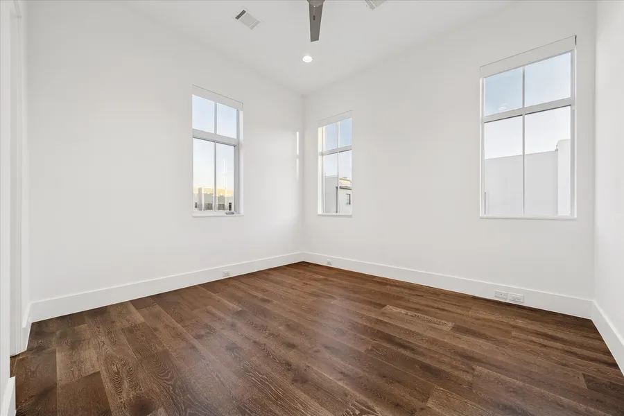 Fall in love with this Sims Luxury Builders home that offers exquisite finishes, positioned on a corner lot in the gated community of Laguna at Lake Pointe. Sugar Land & Walkability aren't two words you ever see together but this home breaks that barrier offering accessibility to shopping & restaurants. This elevator capable home has an open floor plan with tons of natural light & a Chef's Kitchen that features Madeval Cabinetry with Bosch Appliances highlighted by a Waterfall Island. The spacious Primary Retreat has TWO massive walk-in closets with custom cabinetry & a Primary Bathroom that offers floating vanities, double sinks, tub & standing shower. Secondary Bedrooms have en-suite baths & custom closets. Sliding glass doors lead to your 22' balcony where you can enjoy lakeviews. Below, your brick paved driveway leads to your porte-cochere & glass garage door. Elevator capable. No carpet throughout. This is the perfect home for suburban living with an urban lock & leave lifestyle