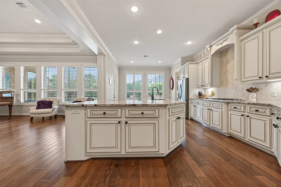 Prime cul-de-sac lot with backyard oasis featuring a sparkling pool and spa! Refined elegance with rich wood flooring throughout the foyer, study, dining, and living areas. Plantation shutters and extensive custom built-ins elevate the space, including a stunning wine grotto. This home offers abundant storage with numerous walk-in closets throughout. The gourmet kitchen boasts an oversized center island, exotic granite countertops, double ovens, and an impressive amount of cabinetry. Primary suite overlooks the backyard and features spa-like bath with jetted tub, dual vanities, and massive walk-in closet. Enjoy a spacious game room with kitchenette, a fully equipped media room ready for movie night, and an upper balcony with backyard views. Generously sized secondary bedrooms include en-suite baths, plus a convenient study nook. Water softener and sprinkler system included. Zoned to award-winning Katy ISD with all K–12 schools located within the CCR community.