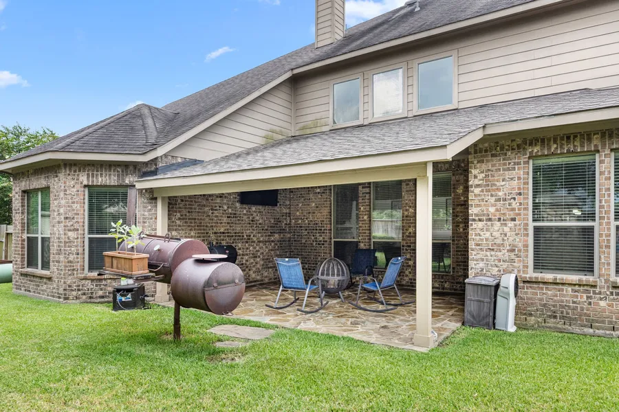 Welcome home to 8215 Paddle Rock Ln! Situated on a premium oversized corner lot, this 5-bedroom, 4-bath impressive home offers nearly 4,500 sq. ft. of light-filled living space with an open-concept layout perfect for entertaining. The interior features soaring ceilings, a fireplace-centered family room, formal dining, and a gourmet kitchen. The downstairs primary retreat ensures privacy with the large bathroom and closet space. Upstairs, family and friends will enjoy the large game room/billiards room alongside the oversized media room. This floor plan is unique to this community and was thoughtfully designed to maximize storage and functionality. The brick exterior, sprawling back yard and recently updated back patio speak for themselves. There is plenty of room for a pool to be added in the future. River Run at the Brazos is conveniently centrally located in this fast-growing, amenity rich community.