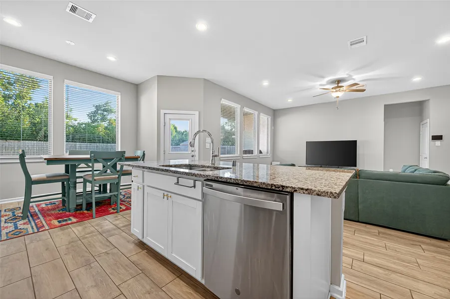 Welcome to this charming 3-bedroom, 2-bath home with a beautiful brick elevation and welcoming 8-foot glass and wood front door. This home offers a bright open-concept floor plan with wood-look tile flooring throughout the main living areas. The spacious family room features a wall of windows that fills the space with natural light. The kitchen overlooks the living area and offers granite countertops, white shaker-style cabinets, stainless steel appliances, and a large island for family gatherings.