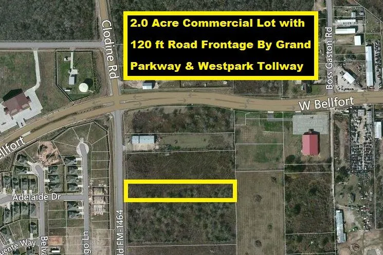 Owner Financed! Cleared 2.0 Acres by W Bellfort w/121 ft of Clodine Road Frontage. Close to TX-99, West Park Tollway & TX-6. Minutes to Schools, Sugar Land, Richmond & Parks. 30 Miles to Downtown Houston, TX Medical Center & 3 Universities. Surrounded by residential properties makes it a prime location for a Church, Retail Center, Medical/Dental Clinic, Office/Warehouse, Urgent Care Facility, Business Center, Gas Station/Convenient Store, Restaurant, Drive-Thru or Animal Clinic. Adjacent 3 Acres is also available for sale either separately or combined. All Utilities!